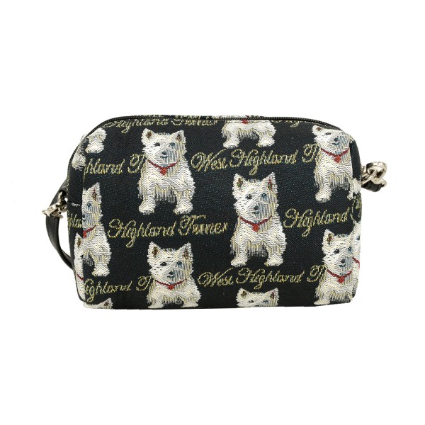 1 pièce(s) par paquet.Composition: 100% polyesterModèle: westieCouleurs: beigeDimention(cm): 20*14,50*2sac porté croisé en tapisserie,fermeture: zip,un compartiment principal, 1pochet zippé, 4 emplacement cartes, bandoulière en PVC amovible et longueur 1,30 metre ajustable, il est interchangeable avec un draggone