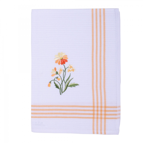 torchon marguerite orangé brodé sur nid d'abeille,60°lavable