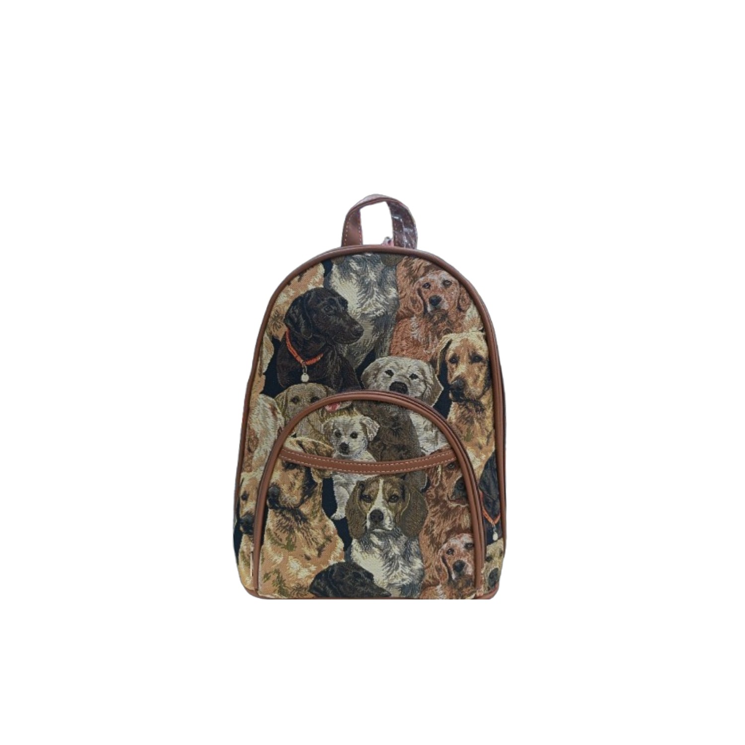 sac à dos en tapisserie, bandoulière en faux cuir,fermeture zippé,1 pochet zippé devant et 1 pochet zippé à dos,intérieure: un compartiment principal,1 poche zippé,1 petit pochet,motif: multi-chiens