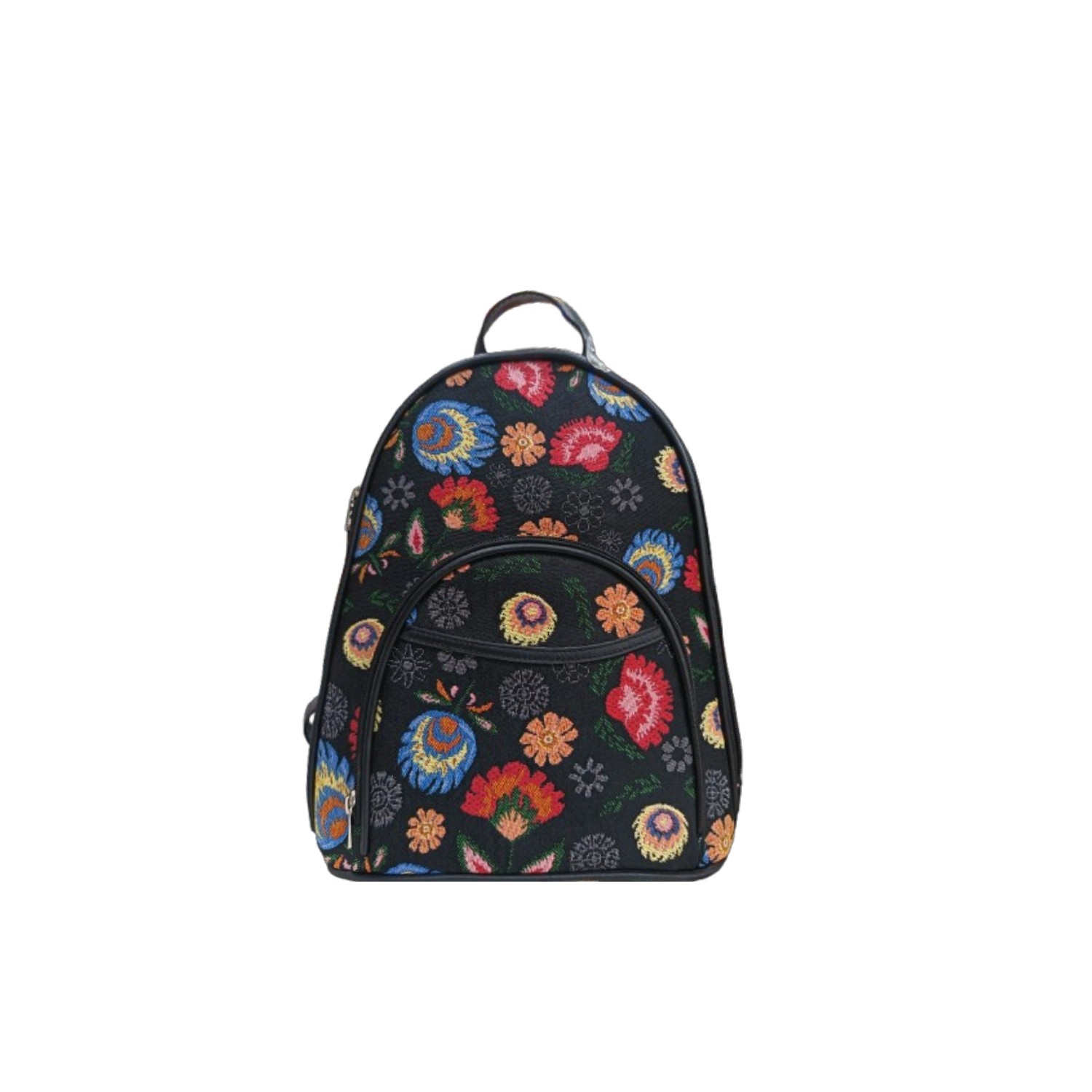 sac à dos en tapisserie, bandoulière en faux cuir,fermeture zippé,1 pochet zippé devant et 1 pochet zippé à dos,intérieure: un compartiment principal,1 poche zippé,1 petit pochet,motif: pensée noir