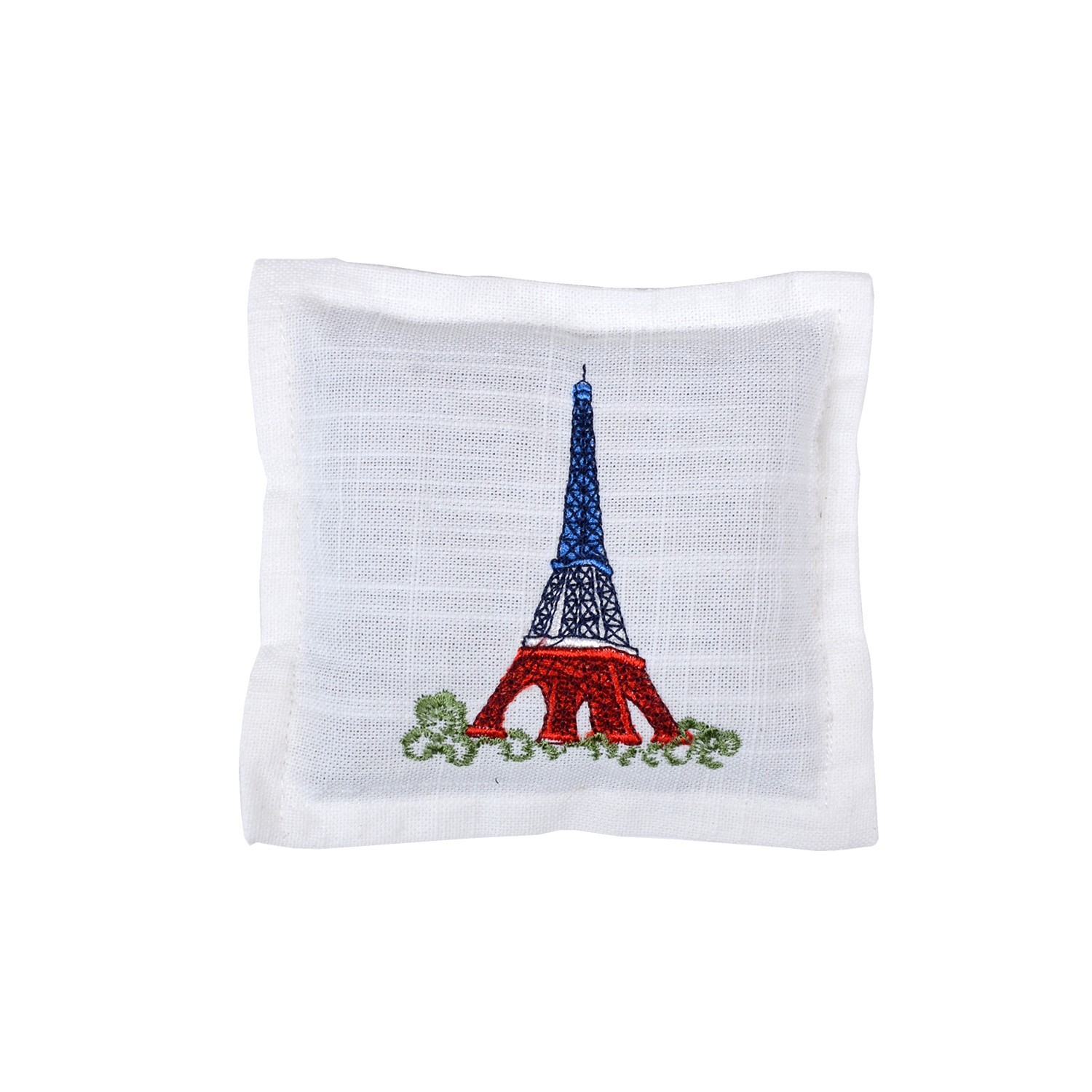 1 pièce(s) par paquet.Composition: 100% polyesterModèle: Tour Eiffel tricoloreCouleurs: blancDimention(cm): 12*12sachet lavande, motif brodé,interieur:fleur de lavande de provence, motif :Tour Eiffel tricolore