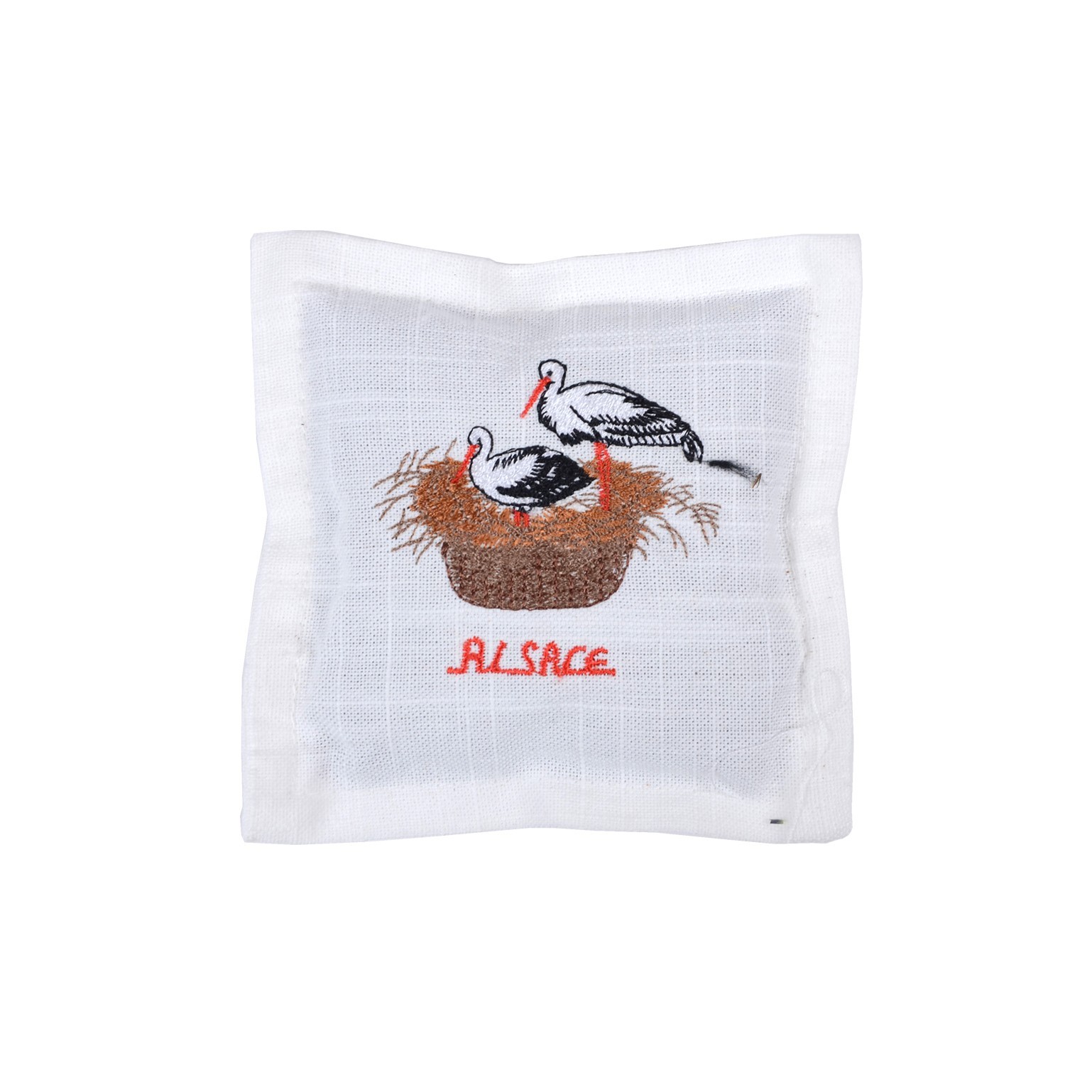 1 pièce(s) par paquet.Composition: 100% polyesterModèle: cigogne dans le nidCouleurs: blancDimention(cm): 12*12sachet lavande, motif brodé,interieur:fleur de lavande de provence, motif : cigognes dans le nid alsace