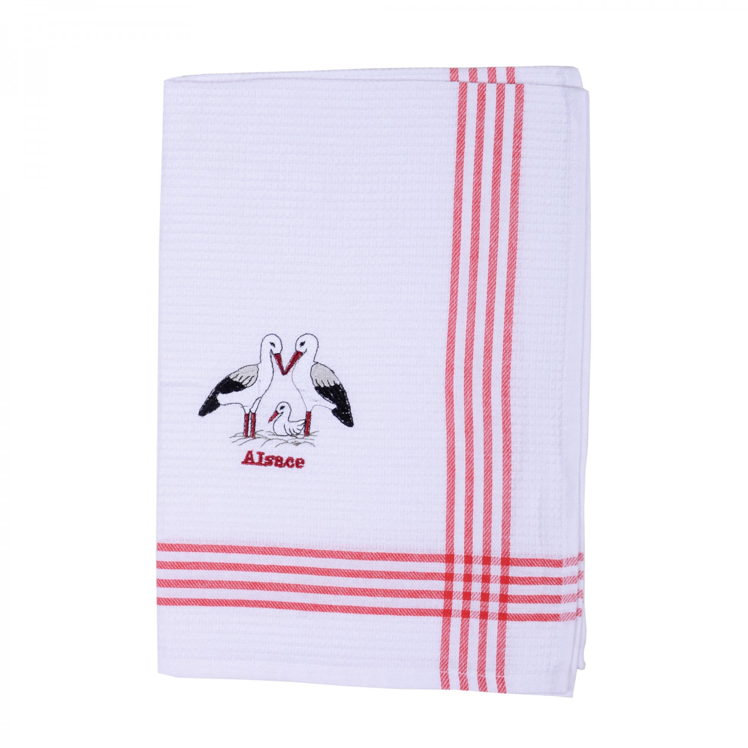 torchon brodé sur nid d'abeille ,60° lavable, motif: cigogne famille