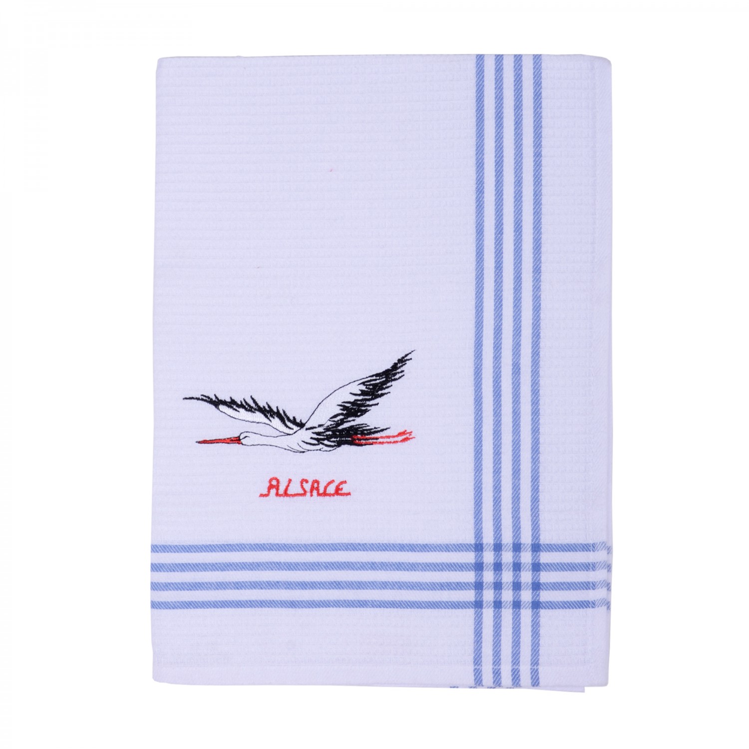 torchon cigogne volant brodé sur nid d'abeille ,60° lavable, motif: cigogne volant